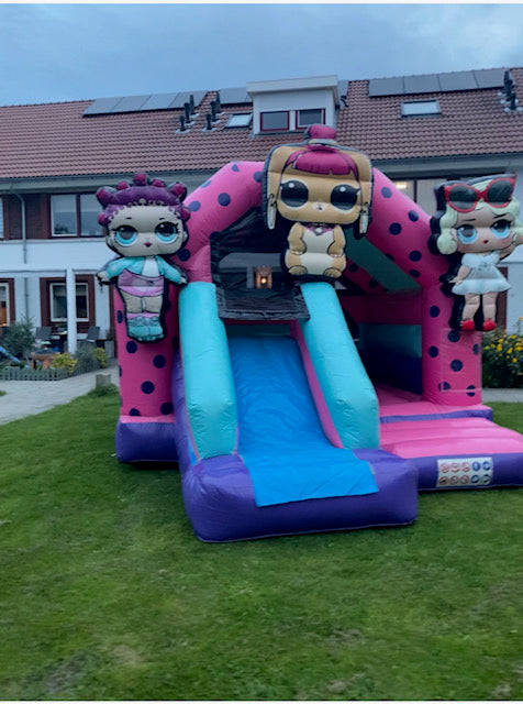 Ons nieuwste aanwinst! Dit fantastische springkussen heeft ook eigenlijk helemaal geen introductie nodig. Elk meisje kent het, elk meisje wilt het, een LoL springkussen op haar feestje. Maak indruk met dit speciaal ontworpen LoL thema slide-combo springkussen op vriendjes, vriendinnetjes en bezorg uw kind het feest van haar leven. Met een afmeting van 480 cm breed en 500 cm lang is er genoeg ruimte om lekker te springen en te glijden.