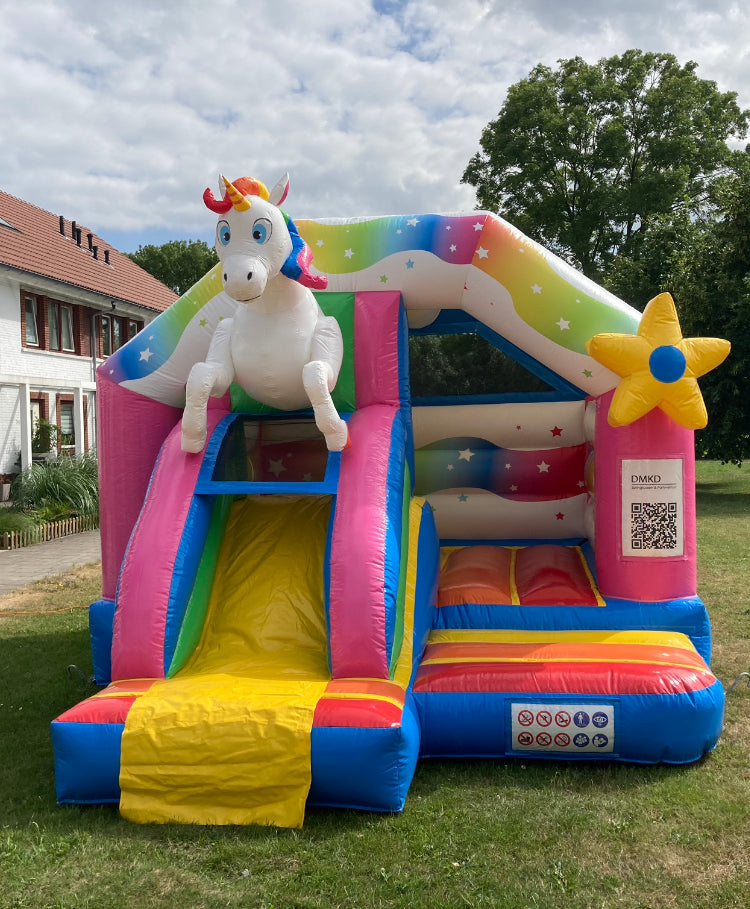 Houdt uw kind van fantasierijke avonturen en kleurrijke dieren? Dan is onze Unicorn-slidecombo het perfecte springkussen voor uw volgende feest of evenement! Met een afmeting van 500 cm lang en 480 cm breed, biedt dit magische luchtkussen urenlang plezier voor kinderen van alle leeftijdscategorieën. Boek dus vandaag nog en creëer een onvergetelijk feest voor uw kind!